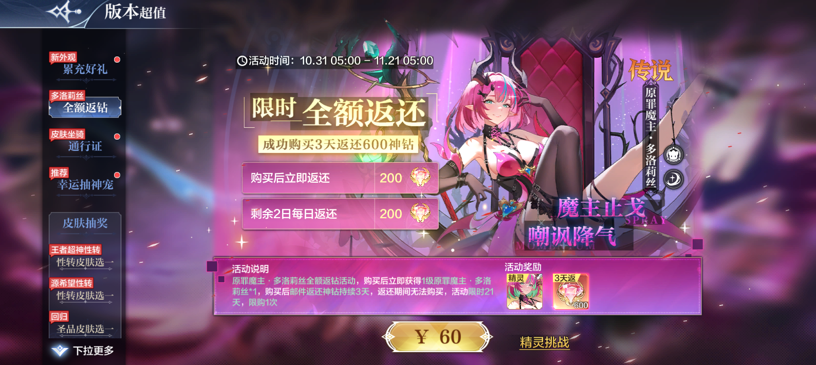 活動內(nèi)容:全額返鉅惠回歸!60元購買立刻獲得精靈【原罪魔主·多洛莉絲】*1,登錄3天全額返神鉆*600!超值優(yōu)惠等你解鎖哦~