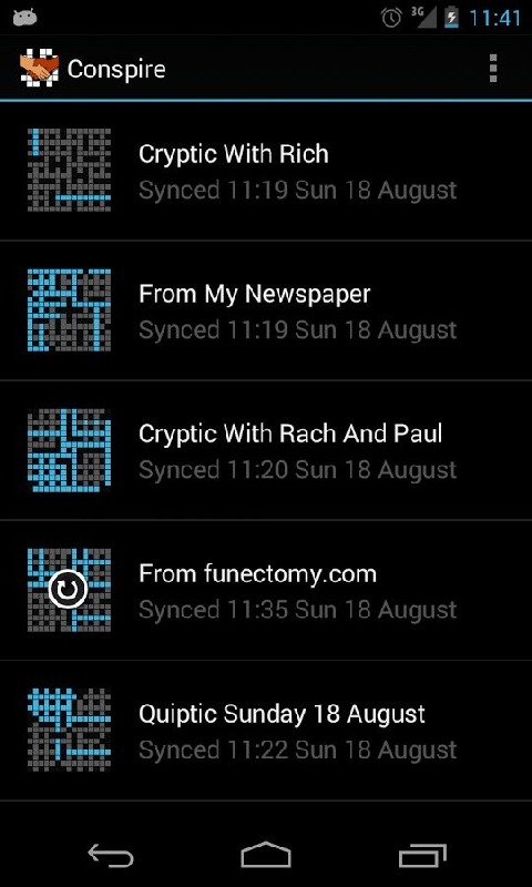 Welcome to Conspire, the crossword scanning and crossword sharing app. Collect your crossword puzzles together in one place so that you can always have them with you, and so that you can collaborate on them with your friends, even when you're not able to be in the same place at the same time.You can import crosswords into Conspire either from a printed newspaper or from the internet. Once imported you can invite your friends to work on your crossword with you. Answers that you type appear on their device. What they type appears on yours.Be online at the same time and talk about the puzzle as you solve it by using Conspire alongside your favourite voice-over-IP app. If you can't be online together then the Conspire server will carefully merge the answers that you and your friends have entered.To see how easy it is import and share crosswords, please follow the Visit Developer's Website link, and check out the movie tutorials. Feel free to email the developer if you have any questions!