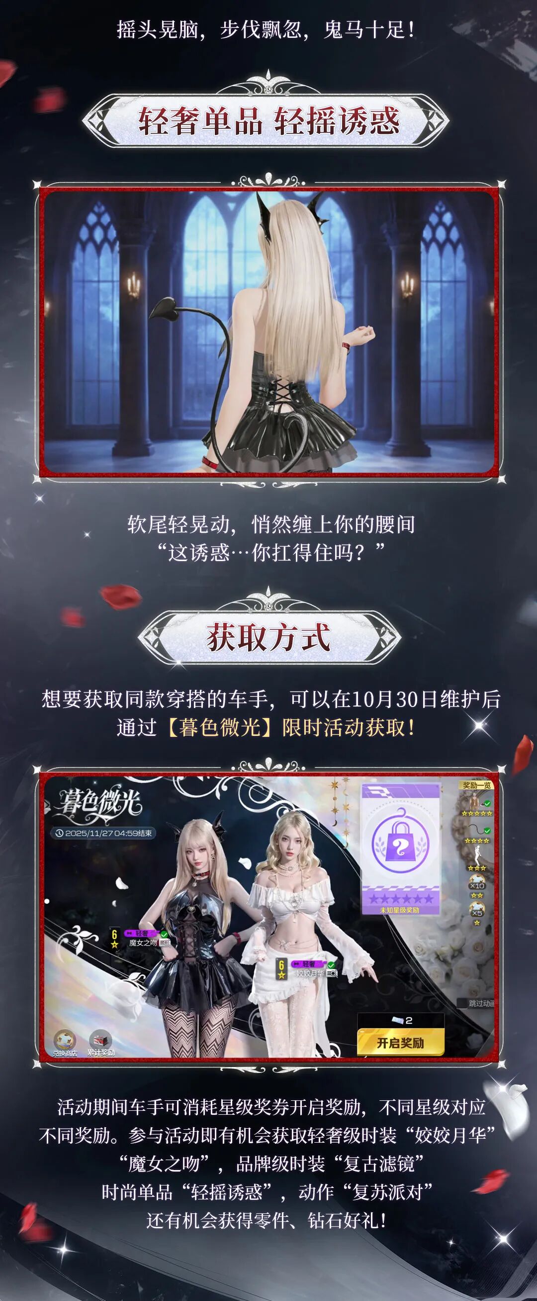 全新輕奢級時裝 「魔女之吻」「姣姣月華」 將于 10月30日上線,參與【暮色微光】活動抽獎還有機會獲得品牌級時裝“復古濾鏡”,零件、鉆石等好禮!快來跟隨小可,一起揭開這場極速與奇幻交織的派對吧~