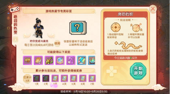 5月19日10:00起,少俠每日可與長(zhǎng)安城“打電玩的小孩”對(duì)話,與其他少俠一同重溫經(jīng)典玩法:貪吃的蛇,每日前2次游玩達(dá)標(biāo)可獲得獎(jiǎng)勵(lì),最高可獲得1級(jí)五行!少俠每日游玩后,還可額外領(lǐng)取“歡樂對(duì)對(duì)碰”抽獎(jiǎng)券“歡樂卡包”,抽取座駕幻膚、召喚獸幻膚和像素風(fēng)武器幻膚。除此之外,還有好玩的馬賽克彩蛋道具:可以將好友變成馬賽克的魔法棒,以及特殊的拍照濾鏡等待少俠體驗(yàn)~
