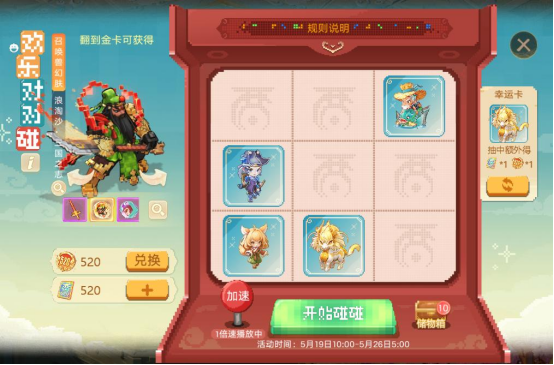 翻出相同卡牌可以觸發(fā)對(duì)對(duì)碰、三連碰、四連碰、六連碰獲得不同獎(jiǎng)勵(lì),若包含不同的全部九張普通卡牌即可觸發(fā)全家福!每次獎(jiǎng)勵(lì)都會(huì)返還一定數(shù)量的歡樂卡包,歡樂碰不停!