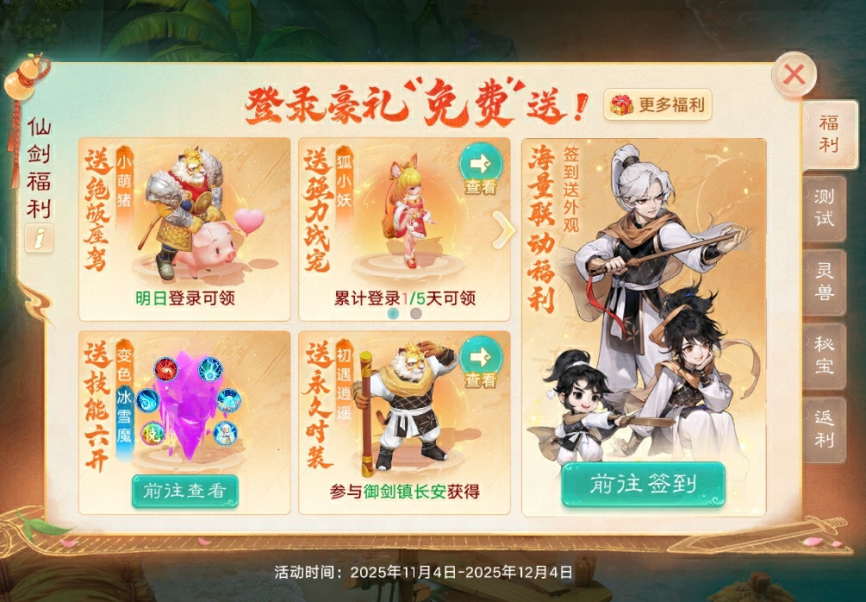 活動(dòng)期間,永久聯(lián)動(dòng)時(shí)裝、童裝、酒葫蘆隊(duì)標(biāo)等多重好禮免費(fèi)送,更有機(jī)會(huì)贏取隨機(jī)神獸、1級(jí)五行材料、女媧后人伙伴!少俠還等什么?精彩仙俠之旅,邀您即刻啟程!