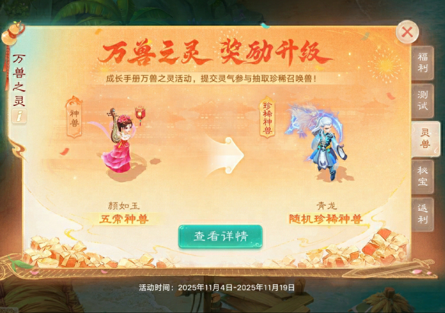 【仙劍奇?zhèn)b】聯(lián)動(dòng)大服,“萬獸之靈”獎(jiǎng)勵(lì)重磅升級(jí)!此次將直接為少俠抽送隨機(jī)珍稀神獸(青龍、白虎、朱雀、玄武等)。趕緊想想你的珍稀神獸如何打造吧,萬一呢?