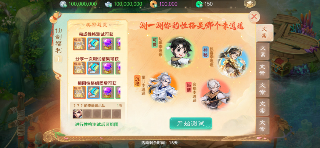 可愛的、神秘的、沉穩(wěn)的、熱情的李逍遙……少俠您屬于哪一種?參與趣味測(cè)試,探尋您的逍遙類型!同時(shí),聯(lián)動(dòng)專服【仙劍奇?zhèn)b】還有新朋禮、仙劍返利等精彩內(nèi)容,靜候少俠體驗(yàn)!