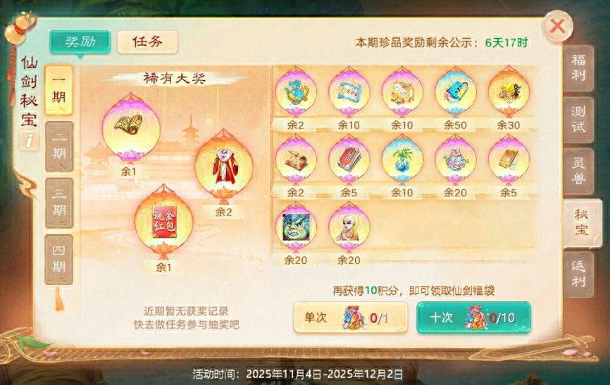 仙劍主題服,福利再升級(jí)!參與仙劍秘寶活動(dòng),即可參與抽取最高6666元現(xiàn)金紅包!還有一級(jí)書、精美時(shí)裝等多重精彩獎(jiǎng)勵(lì),祝各位少俠好運(yùn)!
