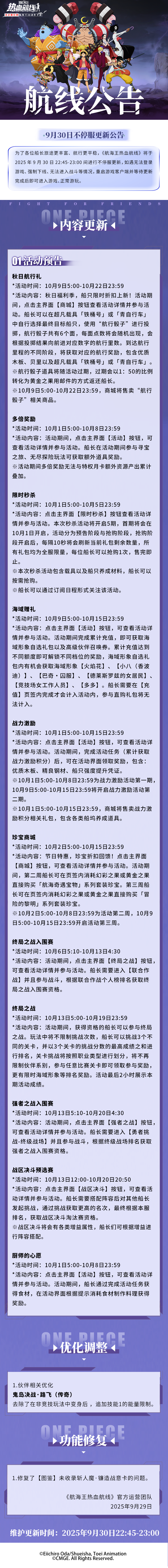 手機游戲> 航海王熱血航線> 游戲新聞> 9月30日不停服更新公告