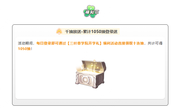 活動期間,每日登錄即可通過【三葉草學(xué)院開學(xué)禮】福利活動直接領(lǐng)取十連抽,共計可得1050抽!