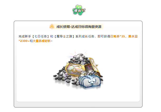 完成新手【七日任務(wù)】和【魔導(dǎo)士之路】系列成長任務(wù),即可獲得召喚券*35、黑水晶*2300+和大量養(yǎng)成材料