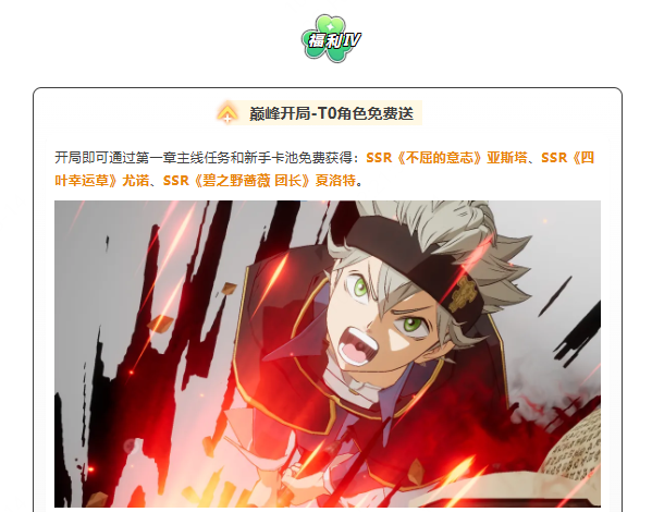 開局即可通過第一章主線任務(wù)和新手卡池免費獲得:SSR《不屈的意志》亞斯塔、SSR《四葉幸運草》尤諾、SSR《碧之野薔薇 團(tuán)長》夏洛特。????????完成【魔導(dǎo)士之路】新手任務(wù)可獲得亞斯塔專屬SSR技能書頁「果斷的決心」。??參與游戲內(nèi)玩法活動還可免費獲得大量黑水晶和召喚券,首日輕松得至少80抽,7日活躍更可獲得400+抽!此外,首日推進(jìn)主線,還可免費獲得主角團(tuán)成員《黑色暴?!分Z艾爾、《黑色暴?!番敻衲呛汀逗谏┡!防?!