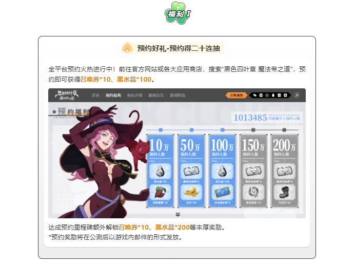 ?全平臺預(yù)約火熱進(jìn)行中!前往官方網(wǎng)站或各大應(yīng)用商店,搜索“黑色四葉草 魔法帝之道”,預(yù)約即可獲得召喚券*10、黑水晶*100。達(dá)成預(yù)約里程碑額外解鎖召喚券*10、黑水晶*200等豐厚獎勵。