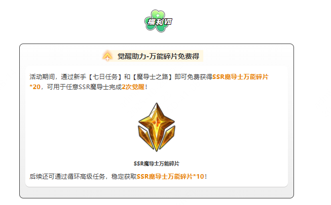 ?活動期間,通過新手【七日任務(wù)】和【魔導(dǎo)士之路】即可免費獲得SSR魔導(dǎo)士萬能碎片*20,可用于任意SSR魔導(dǎo)士完成2次覺醒!后續(xù)還可通過循環(huán)高級任務(wù),穩(wěn)定獲取SSR魔導(dǎo)士萬能碎片*10!