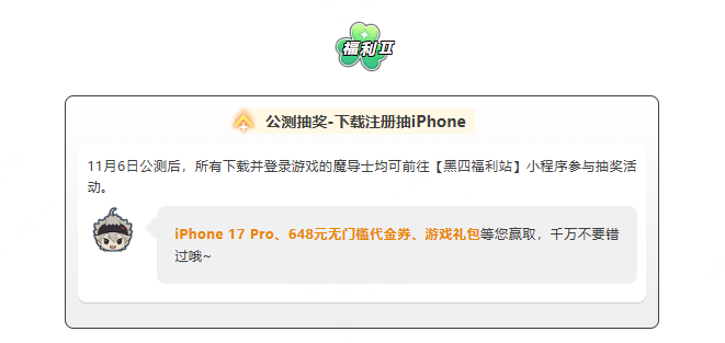 11月6日公測后,所有下載并登錄游戲的魔導(dǎo)士均可前往【黑四福利站】小程序參與抽獎活動。