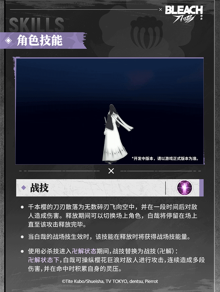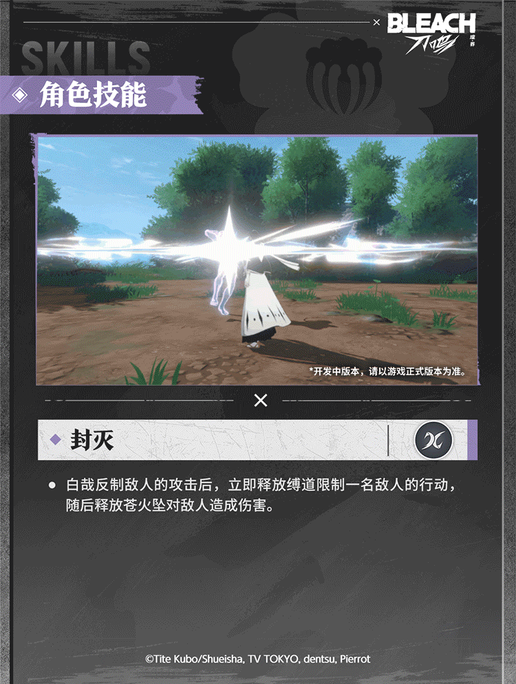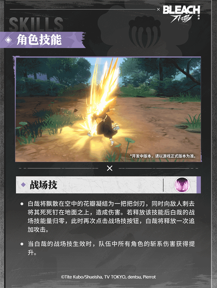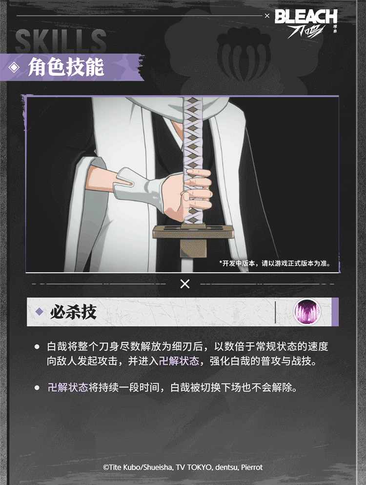 點擊下方圖片,一起查看朽木白哉的技能詳情吧!*研發(fā)中版本,不代表游戲最終品質(zhì)