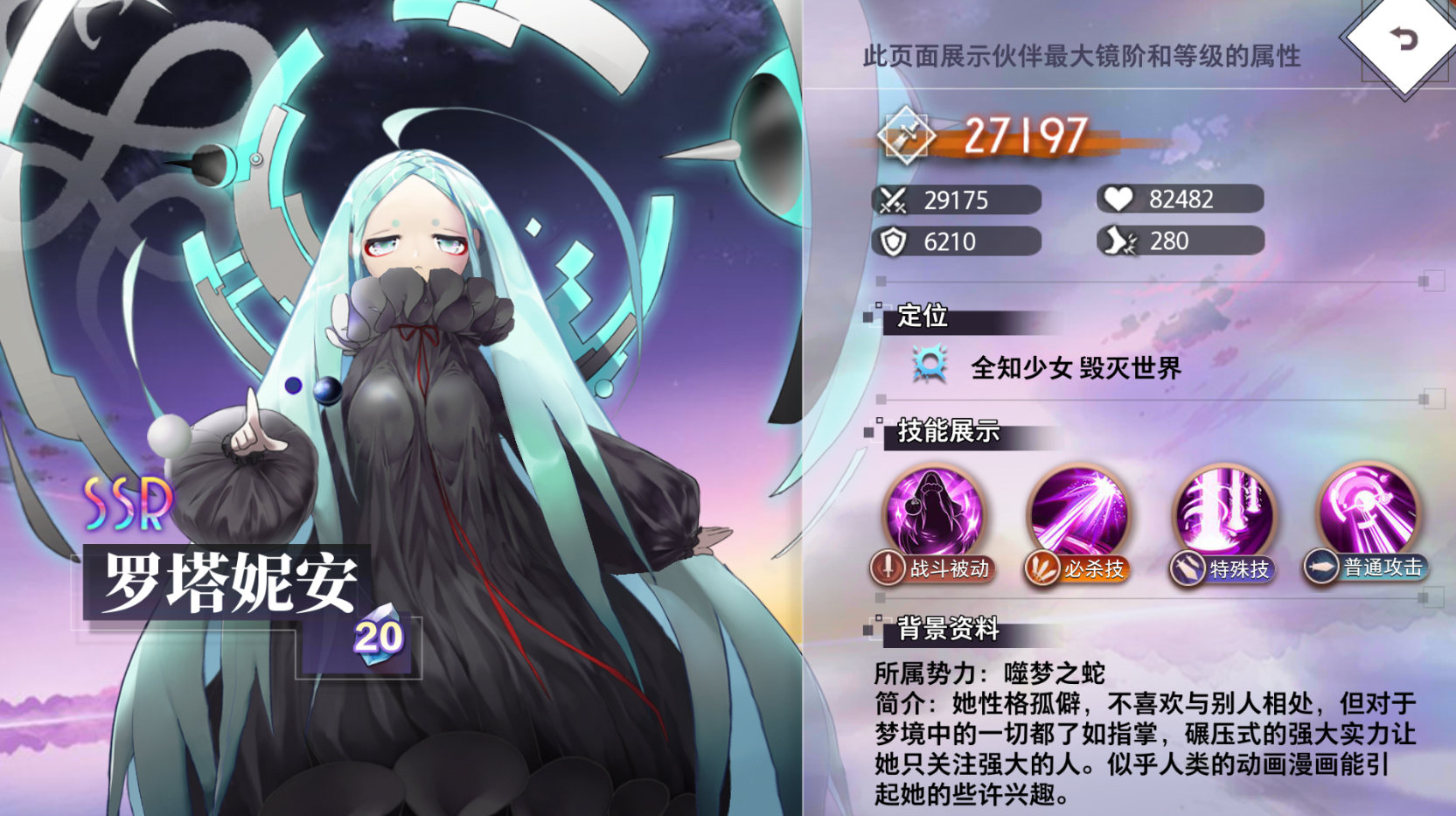 她性格孤僻,不喜歡與別人相處,但對于夢境中的一切都了如指掌,碾壓式的強(qiáng)大實(shí)力讓她只關(guān)注強(qiáng)大的人。似乎人類的動畫漫畫能引起她的些許興趣。