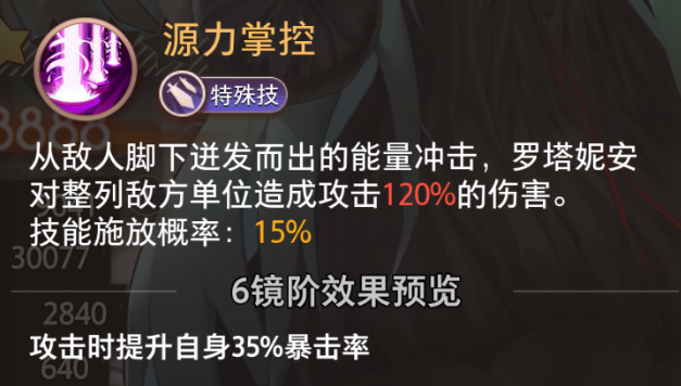 戰(zhàn)場內(nèi)每有1個(gè)敵方伙伴,羅塔妮安提升自身7%傷害率。