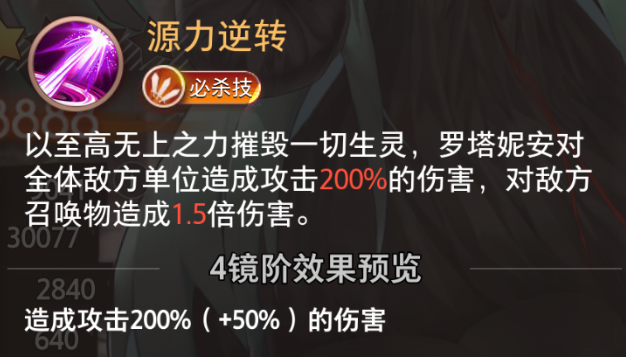 以至高無上之力摧毀一切生靈,羅塔妮安對全體敵方單位造成攻擊200%的傷害,對敵方召喚物造成1.5倍傷害。