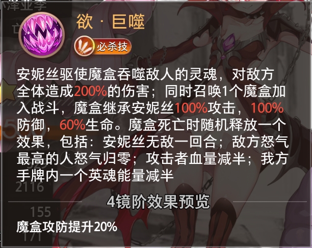 安妮絲驅(qū)使魔盒吞噬敵人的靈魂,對敵方全體造成200%的傷害;同時(shí)召喚1個(gè)魔盒加入戰(zhàn)斗,魔盒繼承安妮絲100%攻擊,100%防御,60%生命。魔盒死亡時(shí)隨機(jī)釋放一個(gè)效果,包括:安妮絲無敵一回合;敵方怒氣最高的人怒氣歸零;攻擊者血量減半;我方手牌內(nèi)一個(gè)英魂能量減半