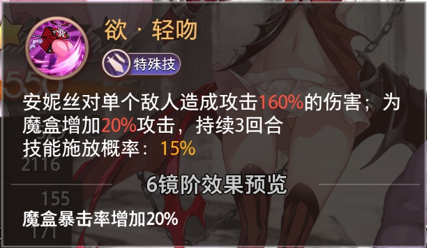 安妮絲對單個(gè)敵人造成攻擊160%的傷害;為魔盒增加20%攻擊,持續(xù)3回合