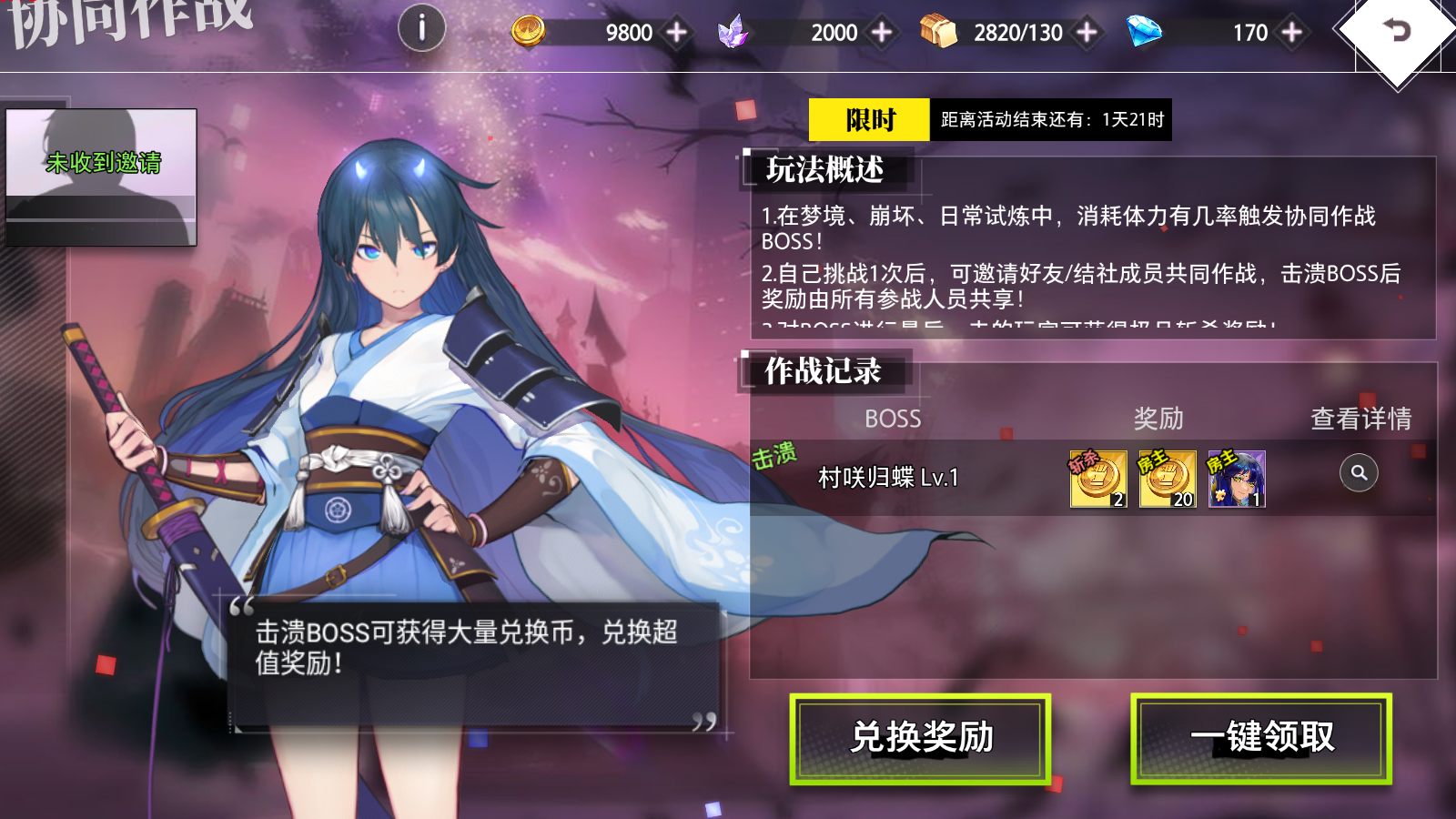 如發(fā)起者1次未挑戰(zhàn)BOSS,則無法獲得任何獎勵~
