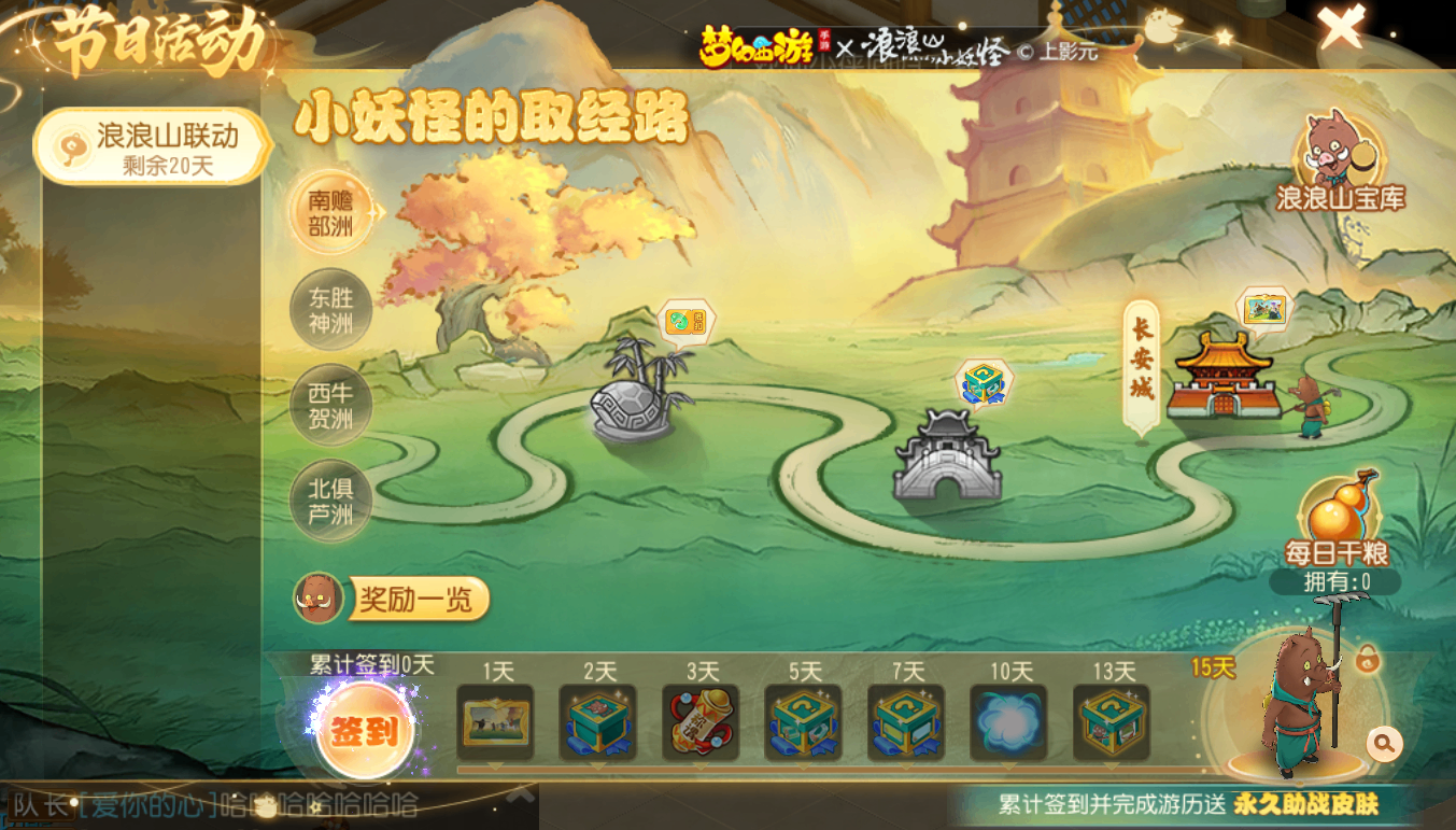 活動期間人物等級達到20級,每日上線簽到即可免費領取聯(lián)動稱謂·夢幻浪浪客、浪浪山登錄幻彩、表情包盲盒等聯(lián)動外觀獎勵;簽到15天并完成“小妖怪的取經路”活動所有游歷任務,即可免費領取永久豬八戒助戰(zhàn)外觀·小豬妖。