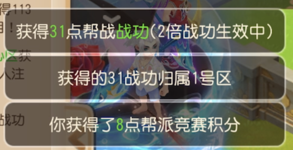 解析:幫戰(zhàn)中幫派A有隊(duì)伍在2號區(qū)獲勝獲得戰(zhàn)功,所獲戰(zhàn)功計(jì)入2號區(qū)域,隊(duì)伍在中心區(qū)域獲勝,戰(zhàn)功計(jì)入中心區(qū)域。簡而言之,在哪個區(qū)域獲得戰(zhàn)功就計(jì)入哪個區(qū)域。