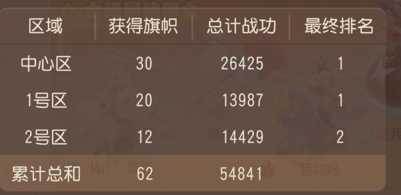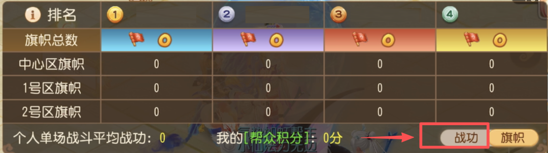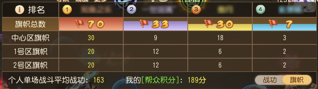 2、各區(qū)域中,根據(jù)區(qū)域總戰(zhàn)功對幫戰(zhàn)進(jìn)行排序,排名1-4名分別可獲得在該區(qū)域20/12/6/2面旗幟。