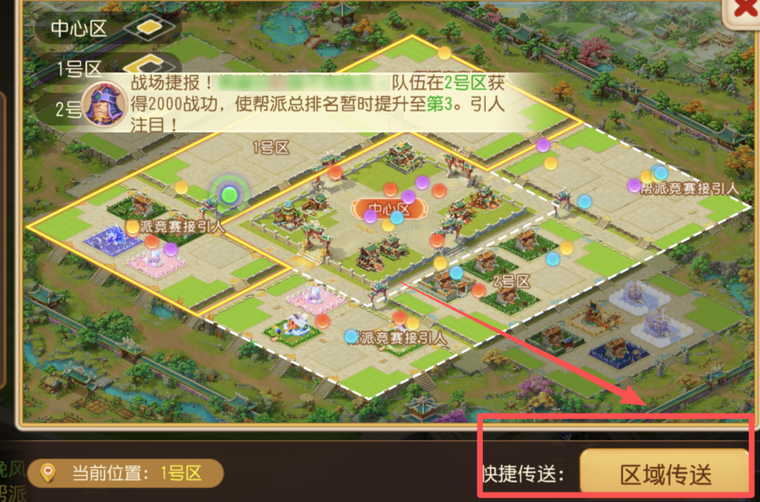 1、在非戰(zhàn)斗期間,在小地圖中可以看到自己幫派可傳送的區(qū)域,選中該區(qū)域位置,即可進(jìn)行傳送;