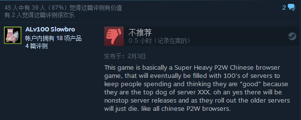 玩家也一針見血的指出游戲的“本質(zhì)”:“這游戲就是一個(gè)超級(jí)重氪的中國(guó)頁游”“新服務(wù)器會(huì)不停地開,大佬們也會(huì)滾到新的服務(wù)器,老服務(wù)器就會(huì)死掉”