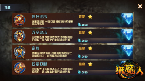 挑戰(zhàn)關(guān)卡中共有30個(gè)項(xiàng)目,難度上并沒(méi)有非常大的區(qū)別,基本都是讓玩家通過(guò)完成任務(wù)來(lái)熟悉游戲的某個(gè)機(jī)制。比如“定身挑戰(zhàn)”中,要求玩家使用定身(或冰凍)技能將怪物固定在地刺陷阱上,利用陷阱將其擊殺。這個(gè)挑戰(zhàn)的目的是讓玩家熟悉自己的限制技能,以及對(duì)場(chǎng)景中陷阱的利用。