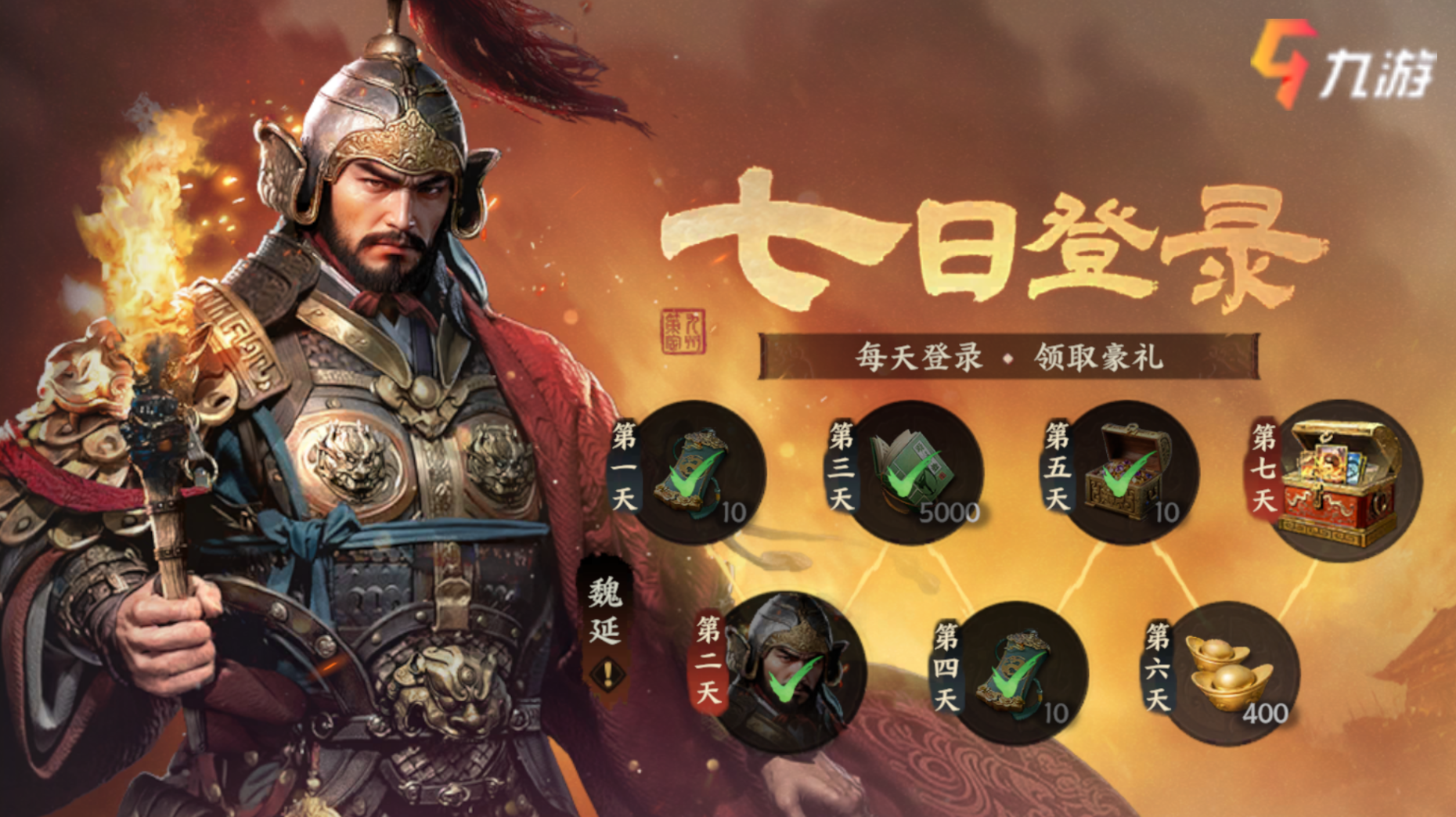 七日登錄:簽到第二天解鎖武將[魏延],作為一個能夠提升防御的武將,能夠給隊伍帶來穩(wěn)定的輸出環(huán)境,前期推圖開荒資源點效果非常不錯。