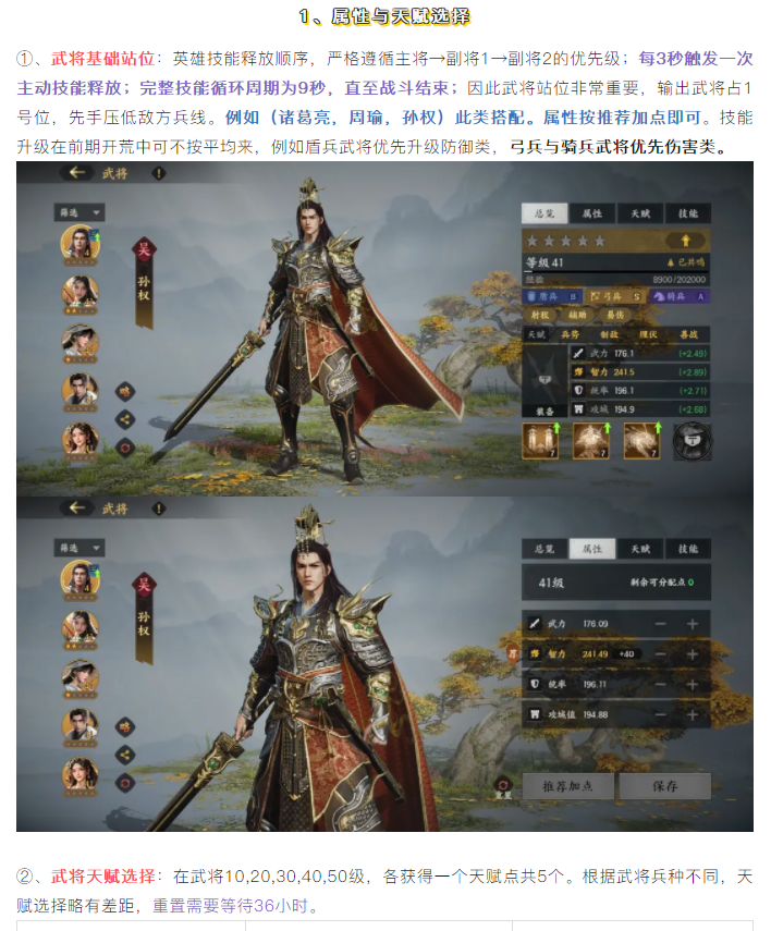 本期內(nèi)容帶來九州武將的屬性與天賦選擇推薦,不同兵種的天賦選擇各有不同,開荒和打架的天賦也有區(qū)分,武將屬性解析,武將的站位模式