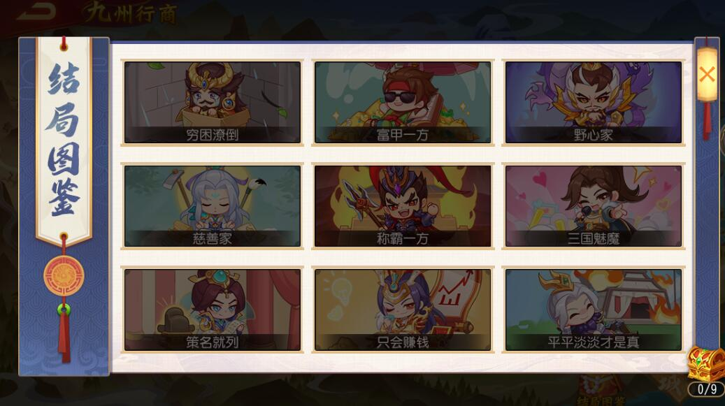 主公每次完成一輪九州行商都會達成一個或多個結(jié)局,首次激活結(jié)局可獲得解鎖獎勵,解鎖全部結(jié)局可獲得額外獎勵。結(jié)局評定與主公完成事件的情況和交易營業(yè)額數(shù)量有關(guān),主公可自由探索,嘗試解鎖不同的結(jié)局哦。