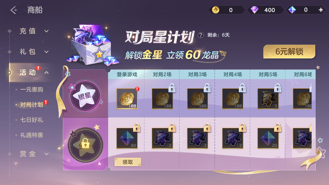 完成對局任務(wù),提升等級免費(fèi)獲取英雄碎片、金幣;付費(fèi)6元解鎖金星可以獲得龍晶*120、龍魂祈福卡、皮膚碎片。