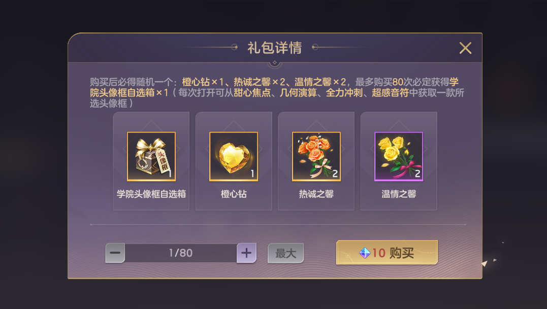學(xué)院秘寶限時(shí)售賣,每抽可得任意獎(jiǎng)勵(lì):橙心鉆*1、熱誠之馨*2、溫情之馨*2,最多購買80次必定獲得學(xué)院頭像框自選箱(內(nèi)含甜心焦點(diǎn)、幾何演算、全力沖刺、超感音符頭像框)。
