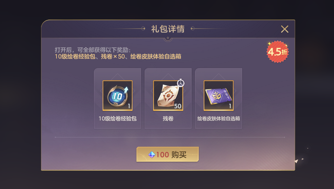 繪卷禮包限時(shí)開售,禮包內(nèi)含10級繪卷經(jīng)驗(yàn)包、殘卷*50、繪卷皮膚體驗(yàn)自選箱。