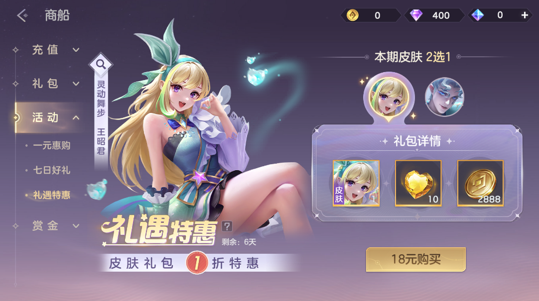 禮遇皮膚禮包限時(shí)1折,王昭君·靈動(dòng)舞步、伏羲·奇跡大師超值2選1。