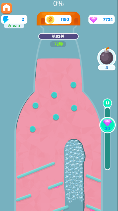 夏天要來了! 海灘! 沙灘! 陽光! 讓我們來喝一瓶蘇打水吧! 感受一下嘴里的泡泡吧! 感受夏日的氛圍吧! 哎呀! 汽水已經癟了,沒有了泡泡,但是底部有好多泡泡球。讓我們幫它們找到出路吧。在屏幕上移動手指,在蘇打水中畫出一條路,讓你的小球釋放出來。避開所有的障礙,小心陷阱。盡量讓更多的泡泡球彈出!
