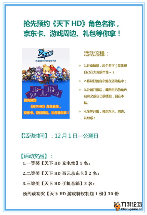 1. 在公測前,小伙伴們要搶先想好自己在游戲中的名字,并回復(fù)本帖,預(yù)約《天下HD》角色名稱;
