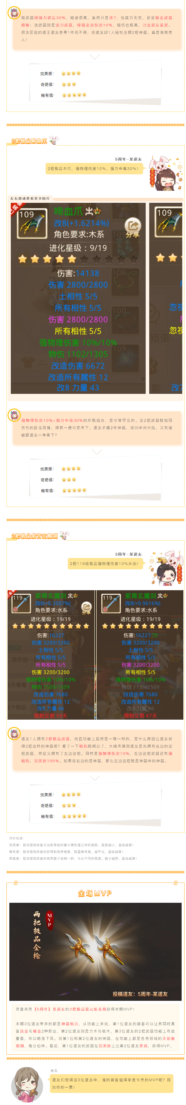 今天道友們都各自帶來了2件神器~2把極品混元斬龍戟,2把極品啼血爪,還有2把極品紫青玄魔劍!究竟誰能拿下MVP?
