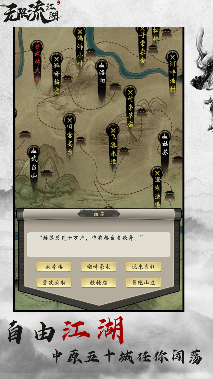 《無(wú)限流江湖》是一款以江湖俠義為背景的文字放置掛機(jī)游戲。游戲主要特色:【開放世界】同一個(gè)江湖,完全隨機(jī)的世界設(shè)定,高自由度武俠大世界任你探索?!救f(wàn)般奇遇】闖蕩江湖、尋訪各路奇遇。拜師學(xué)藝、搜羅奇珍、懲奸除惡、書寫一代人的江湖人生?!竟Ψㄗ杂纱钆洹咳俣喾N功法自由組合,創(chuàng)造家傳絕學(xué),代代相承?!緮?shù)百個(gè)伙伴】江湖中人皆可交往,或結(jié)拜結(jié)婚,或不共戴天,你的行為將影響他們的態(tài)度。【天下第一】參與武林大會(huì),挑戰(zhàn)天下豪杰,贏得天下第一的稱號(hào)。
