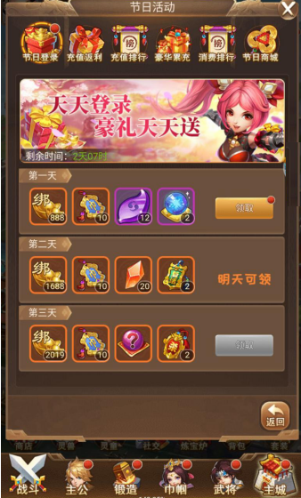 【活動(dòng)說明】:活動(dòng)期間首每日登錄可獲得海量元寶獎(jiǎng)勵(lì),第二天登錄即贈(zèng)送紫色武將關(guān)銀屏。?