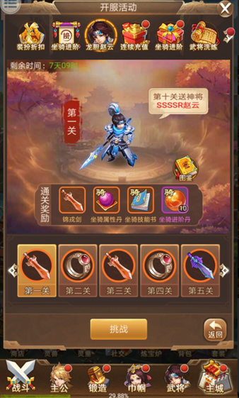 【活動(dòng)說明】:活動(dòng)期間通關(guān)副本,即可獲得豐富獎(jiǎng)勵(lì),不同關(guān)卡對(duì)應(yīng)不同獎(jiǎng)勵(lì)內(nèi)容,通過第十關(guān)將贈(zèng)送SSSSR神將趙云。
