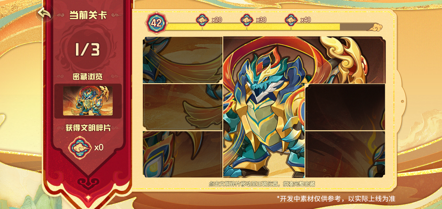 每日通過玩法累積達(dá)到600文明碎片后,將獲得每日禮包,其中包含九色神枝(隨機獲得1~3個)、五銖錢和啟慧之書。累積獲得一定的通關(guān)進(jìn)度,還可以領(lǐng)取九色神枝以及鳳翎([敦煌飛天]活動中的裝扮抽取道具)獎勵。