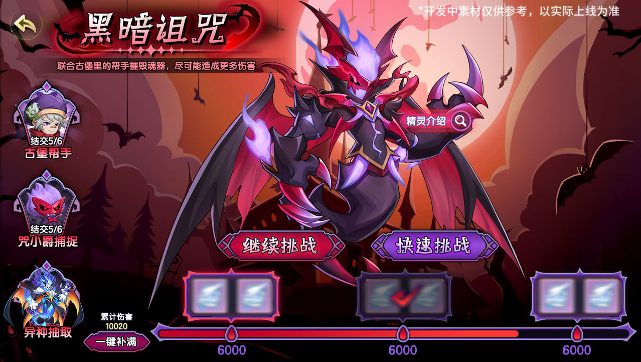 在野外可捕捉到偽裝成小蝙蝠的精靈咒小爵(一階)。活動期間內(nèi),根據(jù)對咒影鬼爵累計造成的傷害值達(dá)到不同要求可獲得相應(yīng)的獎勵,累計達(dá)到對應(yīng)的傷害值可獲得進(jìn)化晶核。