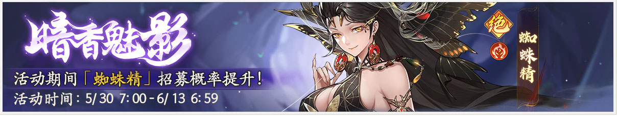 【活動(dòng)說明】活動(dòng)期間內(nèi),【絕】品絕影角色「蜘蛛精(妖)」的出率將在對(duì)應(yīng)卡池中大幅提升。