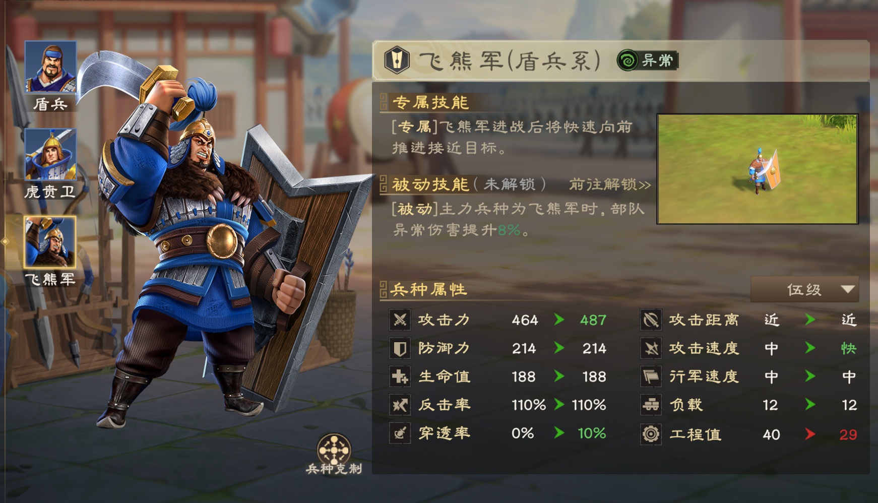 考慮到盾兵擁有更高的生命、防御數(shù)值,一般來說推薦優(yōu)先選擇盾兵構(gòu)筑。盾兵路線選擇飛熊軍,飛熊軍防御高、生命值高,而且可提高異常傷害,在慢速作戰(zhàn)下強度更高。