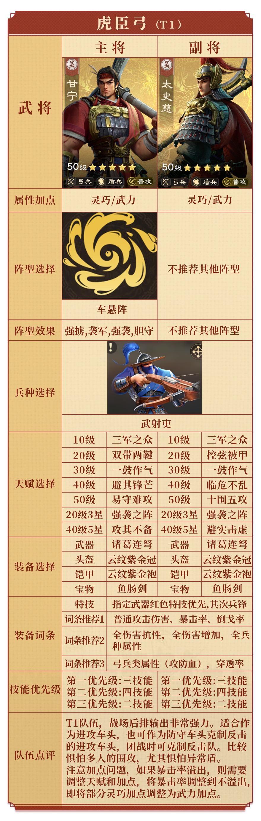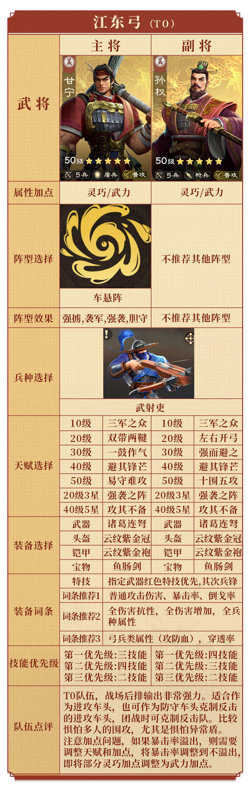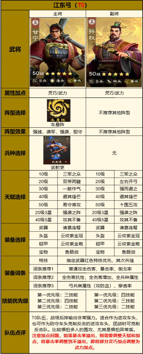 也可搭配太史慈組成虎臣弓,兩者擁有江東虎臣羈絆,在裝備配置較低時(shí)很好用。