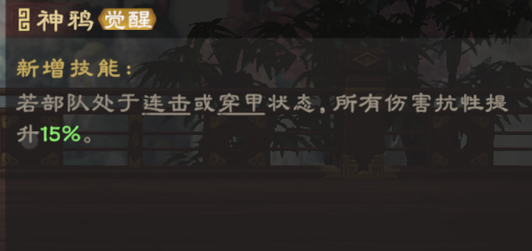 覺(jué)醒后,甘寧隊(duì)伍處于連擊或穿甲狀態(tài)時(shí),所有傷害抗性提升15%。連擊狀態(tài)可通過(guò)甘寧自己獲取,穿甲狀態(tài)則需要車(chē)懸陣,因此甘寧隊(duì)伍最好搭配車(chē)懸陣使用。