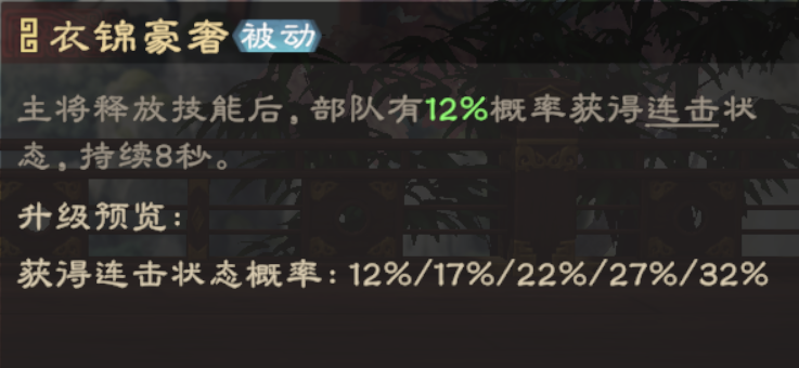 主將施放技能后,部隊(duì)有12%概率獲得連擊狀態(tài)。連擊狀態(tài)下,普攻會(huì)獲得雙倍判定和傷害,能巨幅提升甘寧隊(duì)伍的普攻傷害,建議優(yōu)先升級(jí)該技能。