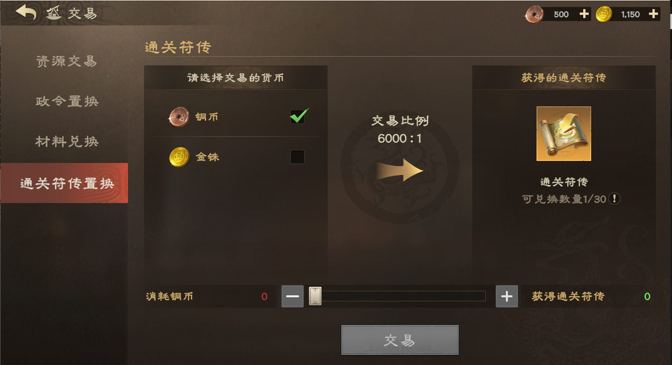 1. 在內(nèi)城市場的交易功能內(nèi),在【通關(guān)符傳置換】頁簽通過金銖或銅幣進行兌換。